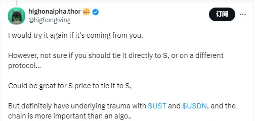 قال باحث DeFi highonalpha عن ذلك: لست متأكدًا مما إذا كان ينبغي ربطه مباشرة بـ S، أم ربطه ببروتوكولات مختلفة… قد يكون من الجيد ربط السعر بـ S، لكن $UST و $USDN بالتأكيد لديهما صدمات محتملة، والأهم من ذلك أن blockchain أكثر أهمية من الخوارزمية نفسها.
