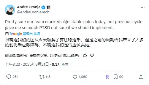 «لقد قمنا بحل مشكلة خوارزمية العملات المستقرة، لكن الجروح التاريخية تجعلني مترددًا.» أطلق المؤسس المشارك لـ Sonic، أندريه كرونجي (AC)، تصريحات صادمة في تغريدة بتاريخ 21 مارس. يزعم فريقه أنهم حلوا العيوب القاتلة لمشاريع سابقة مثل UST من خلال تعديل معدلات الرهن الديناميكية وآلية الحماية متعددة المستويات. على الرغم من الاختراقات التكنولوجية الكبيرة، لا يزال AC يعترف بأن «PTSD الناتج عن انهيار LUNA لم يتلاش بعد».