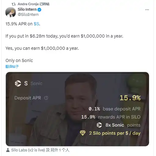 سونيك مؤسس مشارك أندريه كرونجي (AC) أعاد أيضًا نشر التغريدة، حيث أن APY لعملة سونيك S الحالية هو 15.9%، إذا استثمرت اليوم 6.28 مليون دولار، فبعد عام ستربح 1 مليون دولار. هذا أعلى بكثير من عائدات التوكنات Layer1 الأخرى.