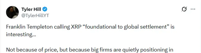 والآن، أطلقت فرانكلين تمبلتون، إحدى أكبر مدراء الأصول في العالم، ليس فقط منتجاً مالياً حول XRP، بل تروج للأصل الرقمي كمكون “أساسي” في المدفوعات العالمية. ويعتقد تايلر هيل أن هذا أمر جدير بالملاحظة بشكل خاص.