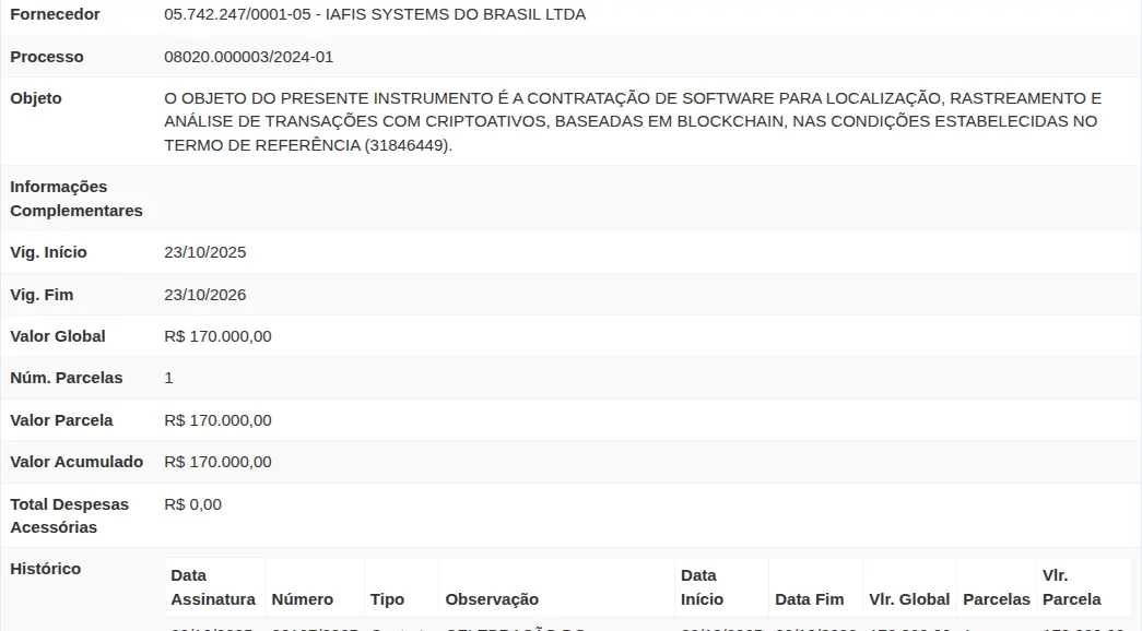 قامت الشرطة الفيدرالية (PF)، من خلال وزارة العدل والأمن العام، بتعاقد مع شركة Iafis Systems do Brasil، شركة استشارات تكنولوجيا المعلومات ومقرها في برازيليا (DF)، لتوفير برامج تركز على تحديد، تتبع وتحليل المعاملات بالعملات المشفرة. العقد، بقيمة 1.7 مليون ريال، يمثل مرحلة جديدة في استراتيجية الحكومة الفيدرالية لتوسيع مراقبة العمليات في سوق العملات الرقمية.