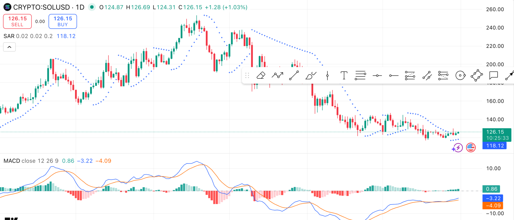 Solana (SOL) se está negociando actualmente a $126.16, lo que representa un aumento del 1.7% en las últimas 24 horas. El precio ha probado un mínimo de $123.59 y alcanzado un máximo de $126.57, con una resistencia inmediata situada por encima del $127 nivel.