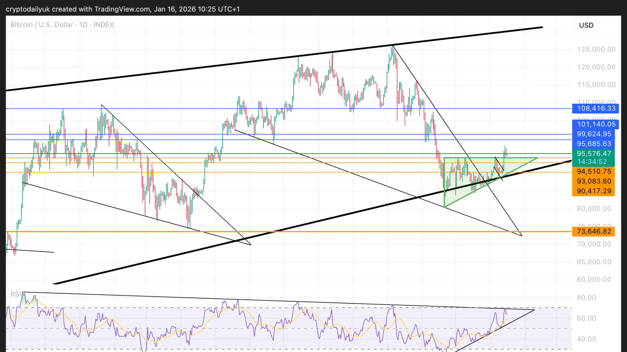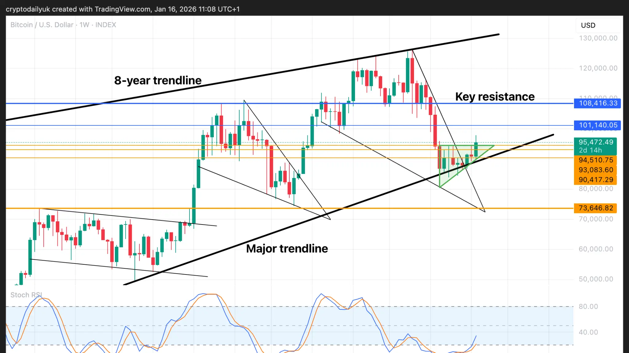 Fuente: CryptoDaily Título original: El precio de Bitcoin en la encrucijada de los $95K: ¿Rompe el soporte de $94,500 o se dispara a $100K? – Análisis BTC 16 de enero de 2026 Enlace original: El precio de Bitcoin subió a casi $98,000 el martes, pero desde entonces el precio ha caído casi hasta el nivel de ruptura de $94,500. En los últimos días ha tenido lugar una fase de distribución. ¿Ahora Bitcoin se dirigirá hacia los $100,000, o vamos a ver más movimientos laterales o bajistas primero?
