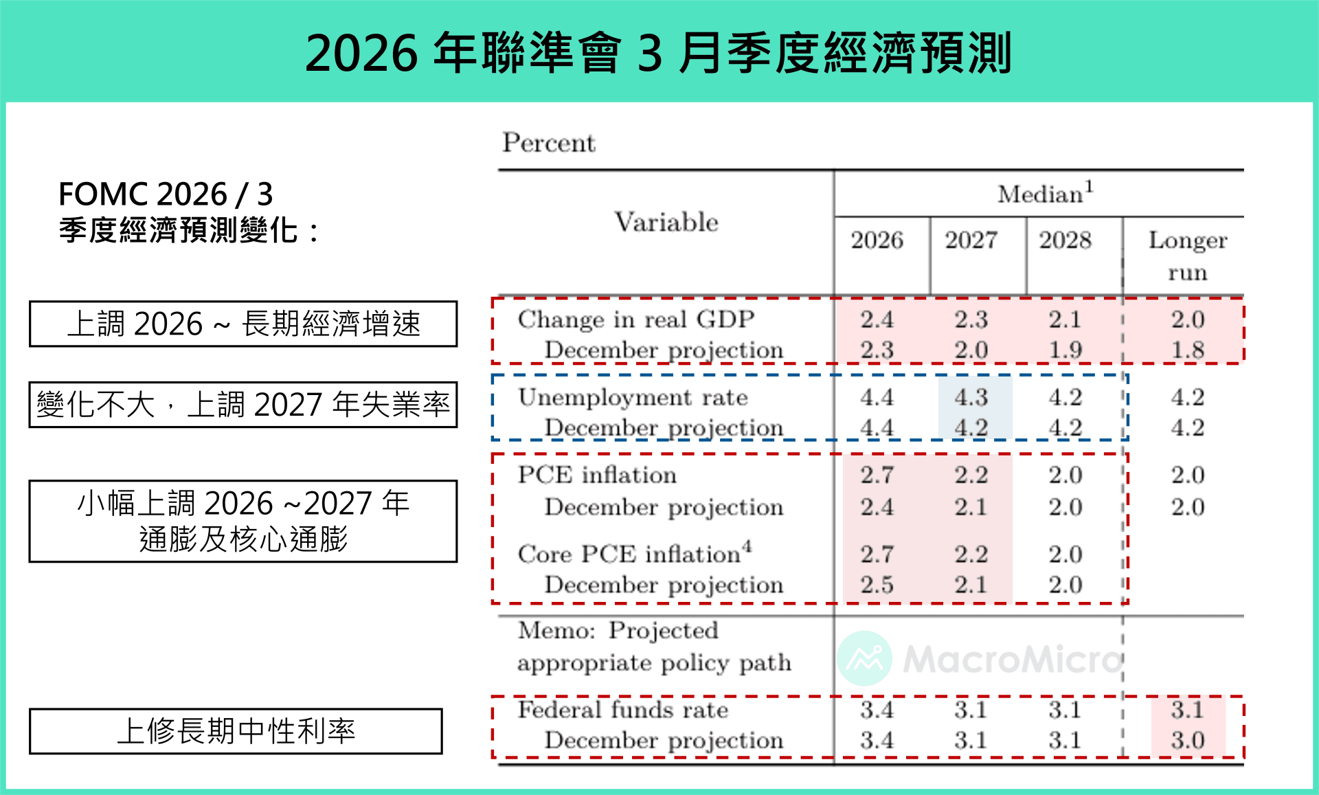 3. La estimación SEP ajustó ligeramente al alza el crecimiento económico para 2026 a 2.4% (antes 2.3%), y la inflación y la inflación subyacente a 2.7% (antes 2.4%) y 2.7% (antes 2.5%), indicando que los miembros consideran que el impacto del conflicto entre EE. UU., Irán y Israel será de corto plazo. Además, revisaron al alza la proyección de crecimiento económico de EE. UU., reflejando mejoras en productividad en los últimos años.