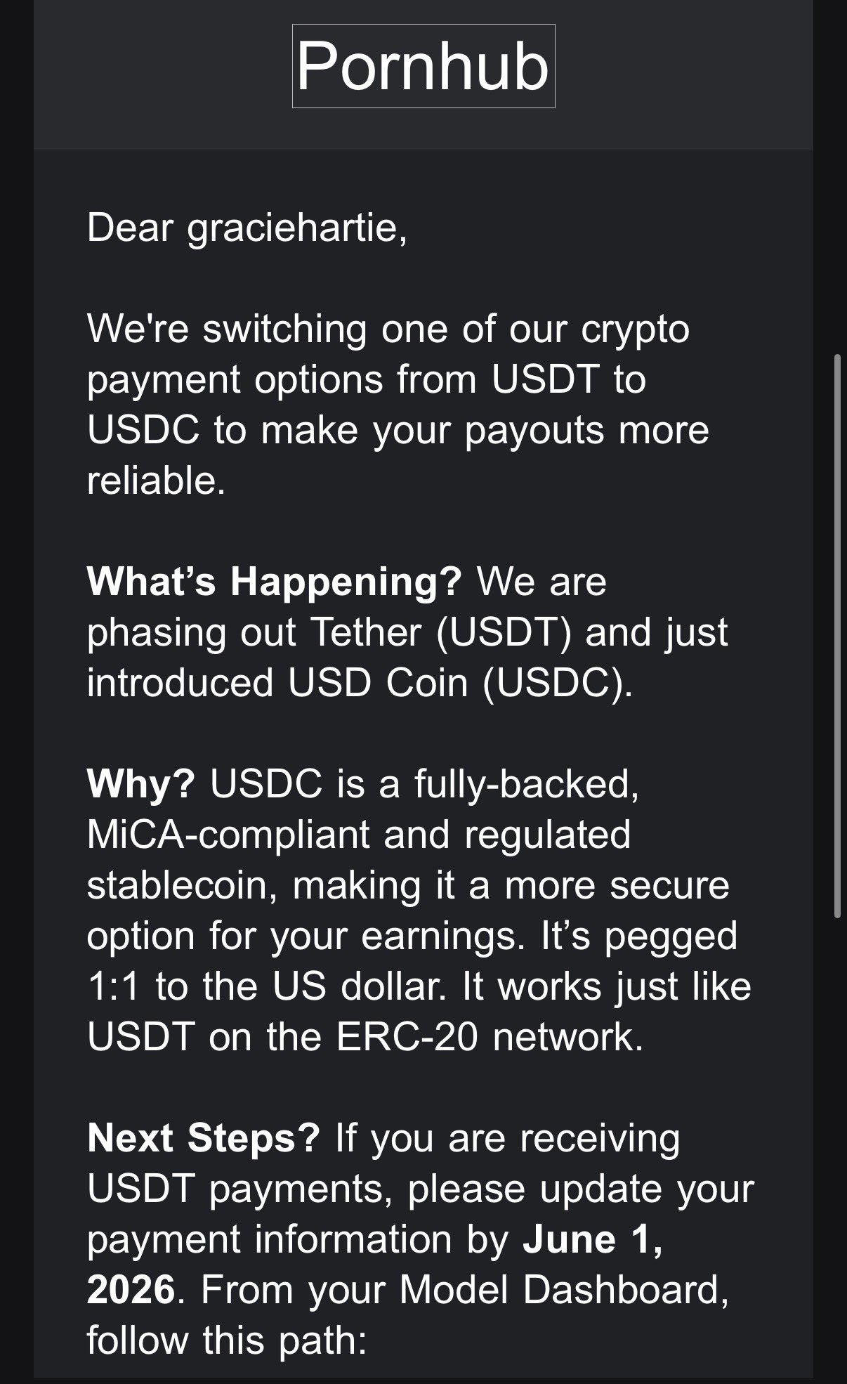 Recientemente, la plataforma para adultos Pornhub ha dejado de usar $USDT como herramienta de pago para creadores, optando por $USDC, emitido por Circle.