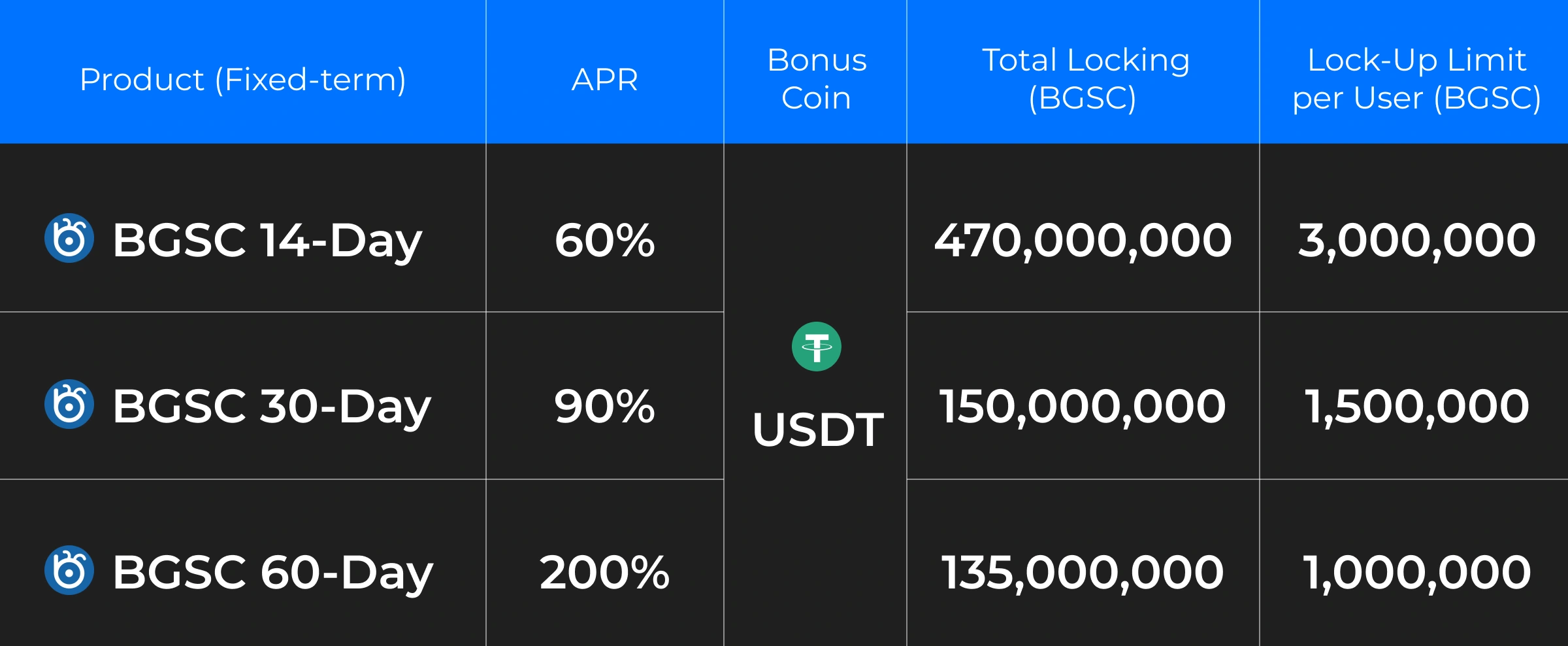 Si vous investissez 1 000 000 BGSC dans un produit à terme fixe de 30 jours avec un APR de 90 %, vous recevrez vos gains totaux dans les 24 heures suivant la souscription : 1 000 000 × 90 % ÷ 360 × 30 = 75 000 BGSC. Ce montant sera converti en USDT et crédité sur votre compte spot ou unifié.