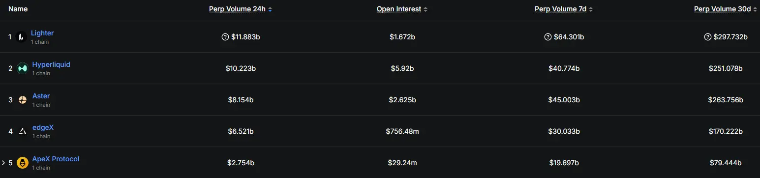 Selon les données de DefiLlama, Lighter occupe actuellement la première place parmi les DEX de contrats perpétuels décentralisés en termes de volume de transactions quotidien et hebdomadaire. Son volume de transactions quotidien atteint environ 11,9 milliards de dollars, et son volume hebdomadaire dépasse 64,3 milliards de dollars. Au cours des 30 derniers jours, Lighter a enregistré un volume de transactions de contrats perpétuels d’environ 297,7 milliards de dollars, devant Hyperliquid avec 251,1 milliards de dollars, consolidant sa première place sur le marché.