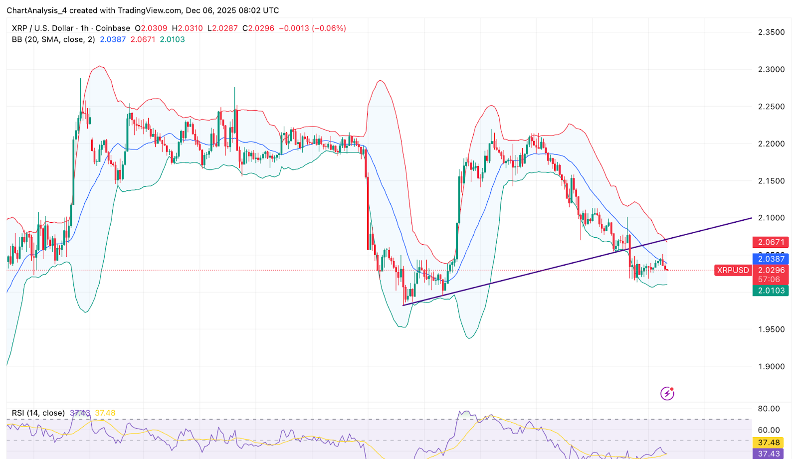 Sur le graphique horaire, le XRP est passé sous une ligne de tendance ascendante à court terme qui soutenait précédemment un léger rebond. Cette cassure a entraîné un retour dans la moitié inférieure des bandes de Bollinger, montrant que la pression baissière reste active. Les tentatives de reprise de la ligne de tendance ont été rejetées et le prix consolide désormais en dessous, ce qui maintient un biais négatif à court terme.