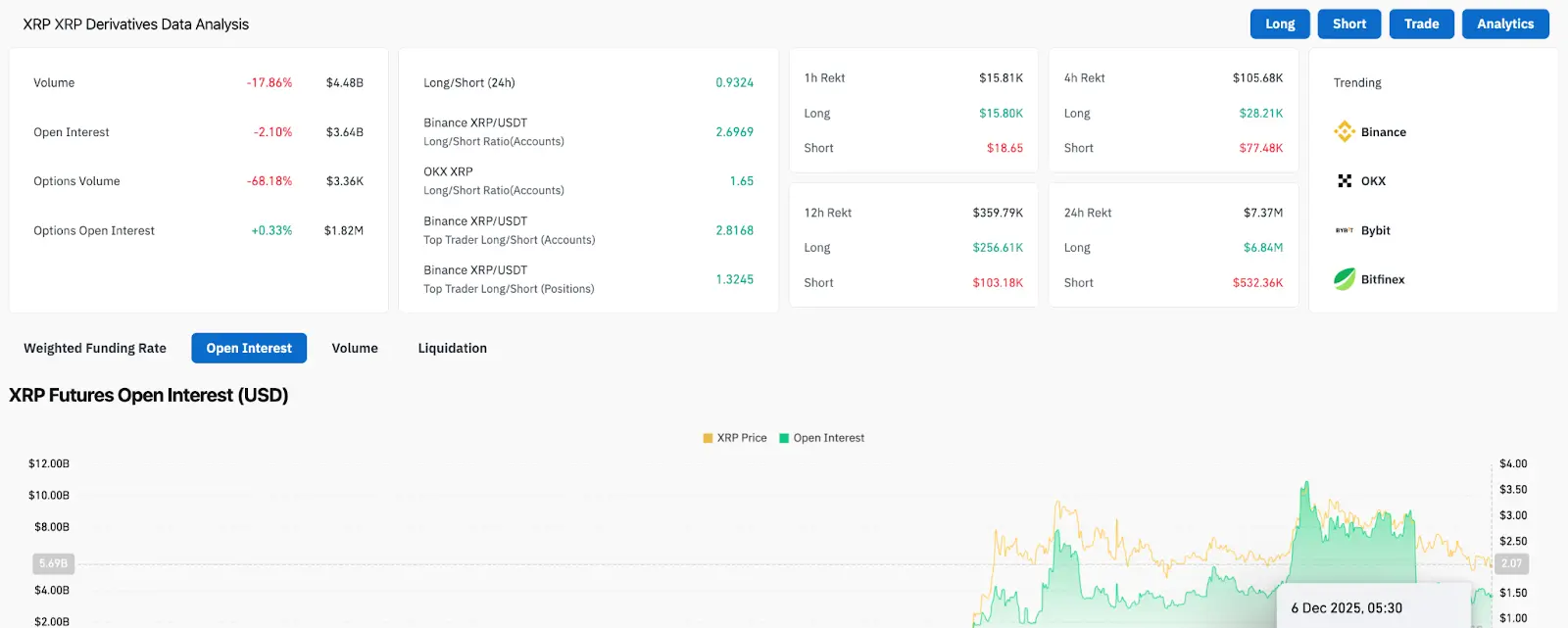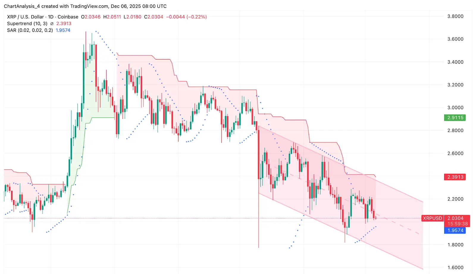 Le prix du XRP se négocie aujourd’hui autour de 2,03 $, prolongeant une baisse régulière qui persiste depuis septembre et poussant le jeton plus profondément dans un canal baissier contrôlé. Le prix n’a pas réussi à maintenir une tentative de rebond de courte durée et teste à nouveau des niveaux de support inférieurs alors que le sentiment reste fragile.