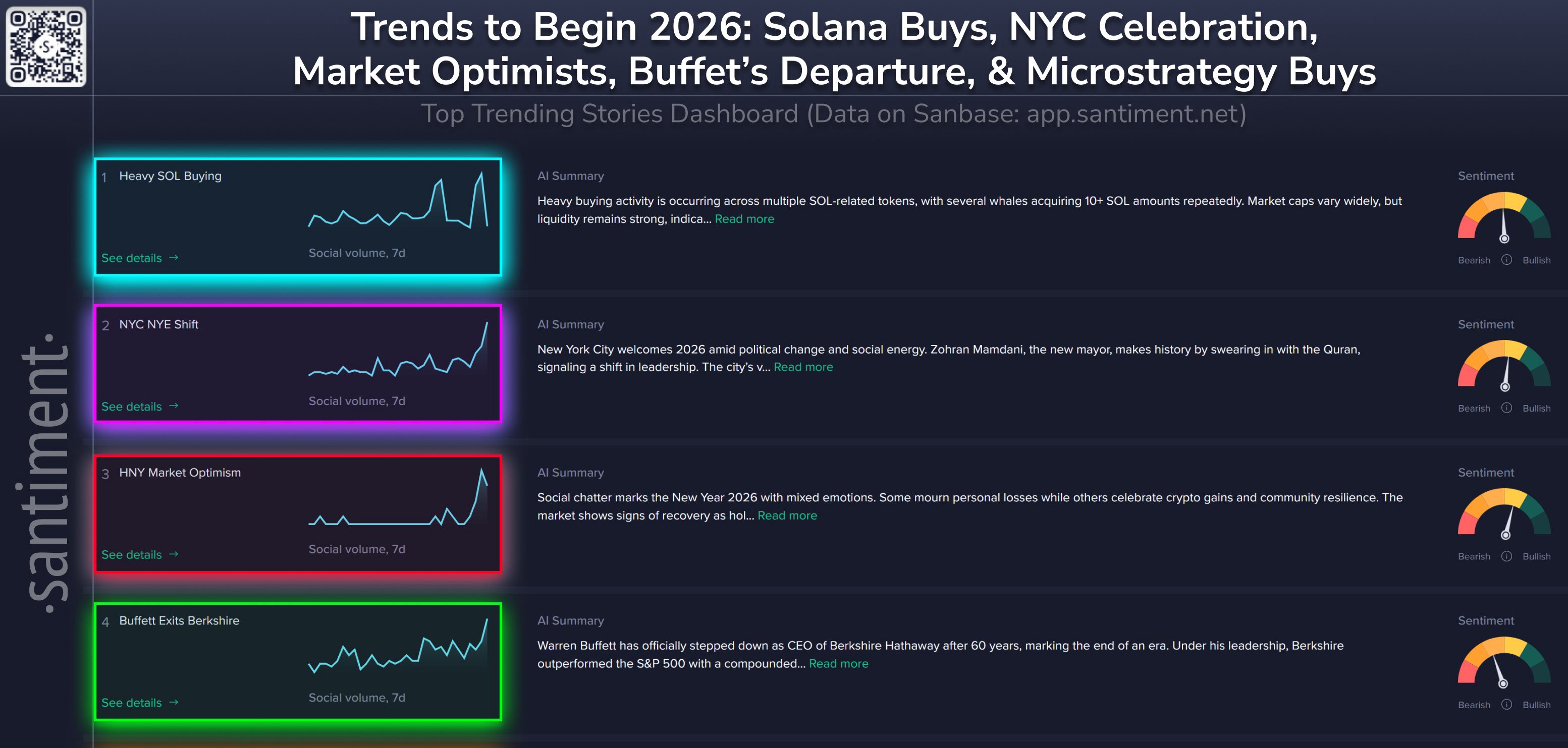 Source : CryptoNewsNet Titre original : SOL accumulation tops crypto trends on New Year’s Day : Santiment Lien original : Les marchés de la cryptomonnaie ont lancé 2026 avec un focus sur Solana, car les données de Santiment ont montré que la discussion concernant l’accumulation de jetons liés à SOL par les baleines était la tendance principale jeudi.