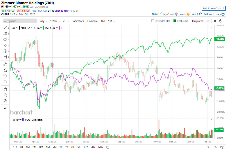 En se concentrant davantage, Zimmer a surperformé le ETF des dispositifs médicaux américains (IHI), qui a connu une baisse de 9,3 % au cours des 52 dernières semaines et une baisse de 6 % en 2026.