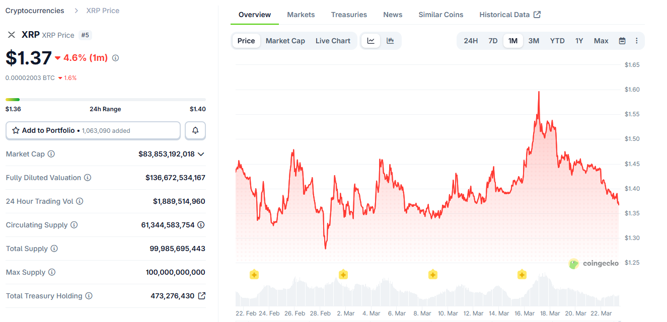 Au moment où nous écrivons ces lignes, XRP s’échange autour de 1,37 $ ; en baisse de 2,1 % sur la journée et d’environ 7,4 % sur la semaine. Avec cela, sa capitalisation boursière totale se situe autour de 84 milliards de dollars, ce qui en fait la cinquième plus grande cryptomonnaie derrière Bitcoin, Ethereum, Tether et BNB.
