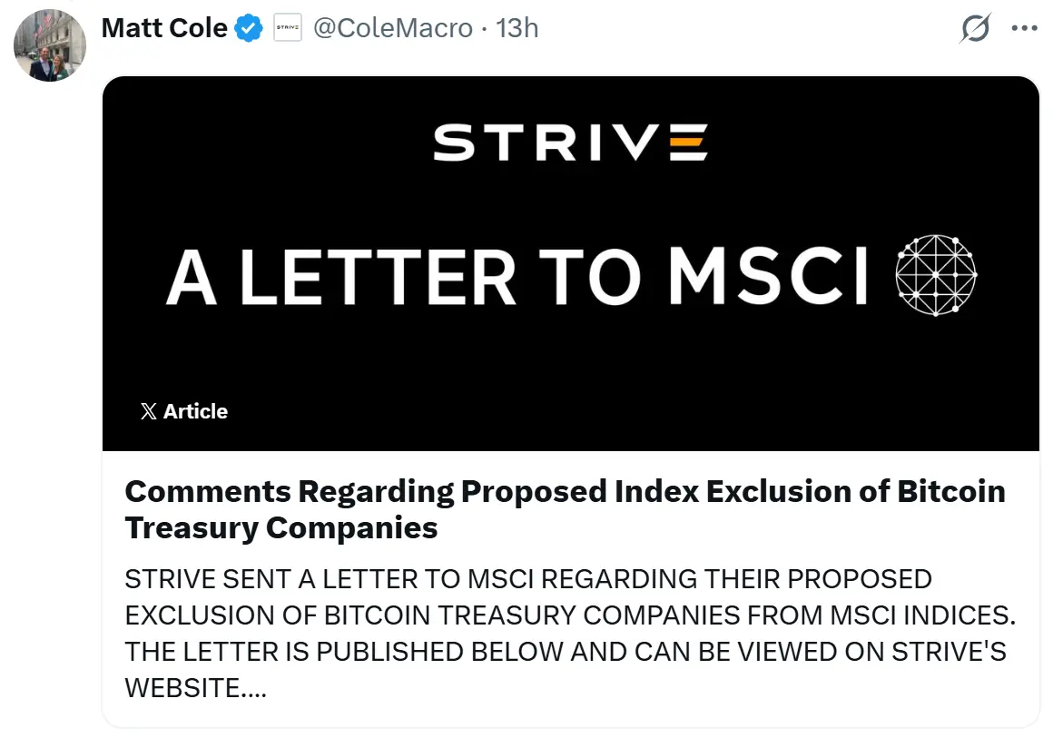 Strive yang terdaftar di Nasdaq, perusahaan treasury Bitcoin terbesar ke-14 yang terdaftar secara publik, telah mendesak MSCI untuk mempertimbangkan kembali usulan pengecualian perusahaan pemegang Bitcoin besar dari indeksnya.