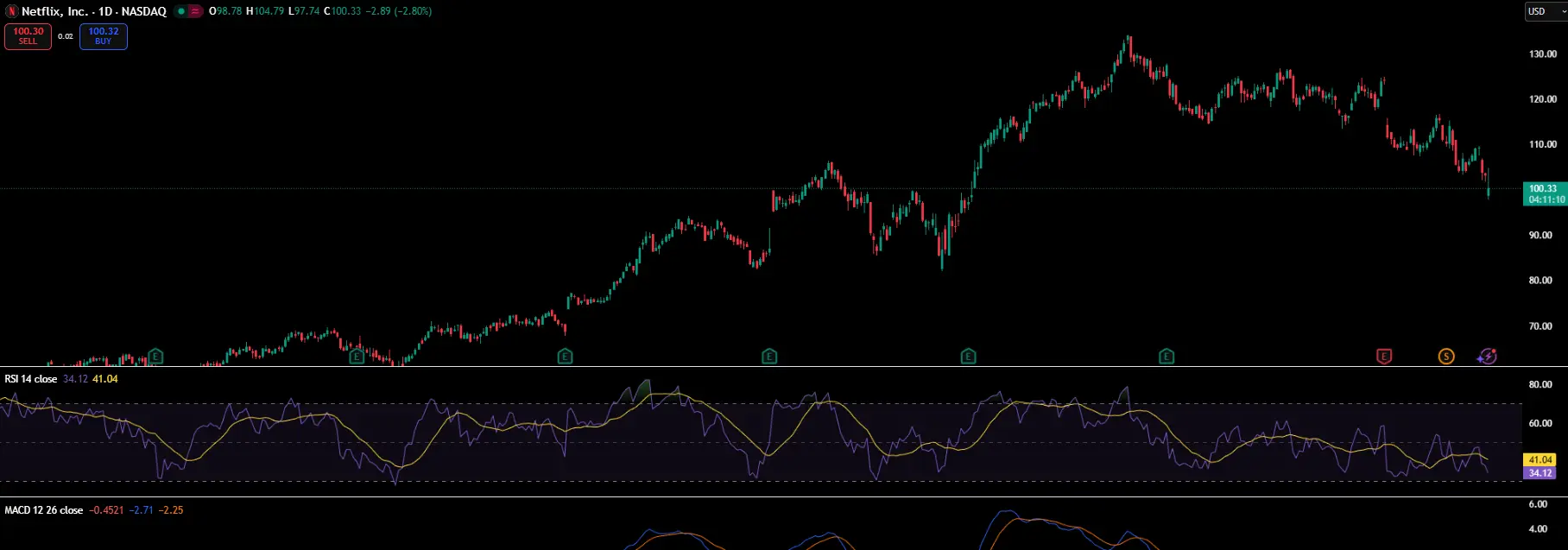 Saham Warner Bros Discovery naik lebih dari tiga persen setelah pengumuman, tetapi Netflix menyikapi berita ini dengan lebih hati-hati. Sahamnya turun pada awalnya dan memperpanjang kerugian menuju sekitar tiga persen secara intraday, diperdagangkan di kisaran $100,33. Indikator sentimen pasar mencerminkan kehati-hatian ini: relative strength index berada di kisaran 41, menunjukkan momentum yang melemah namun belum mencapai kondisi oversold, sementara tren MACD tetap negatif, mengisyaratkan investor masih menunggu untuk melihat seberapa besar dampak integrasi kesepakatan ini.