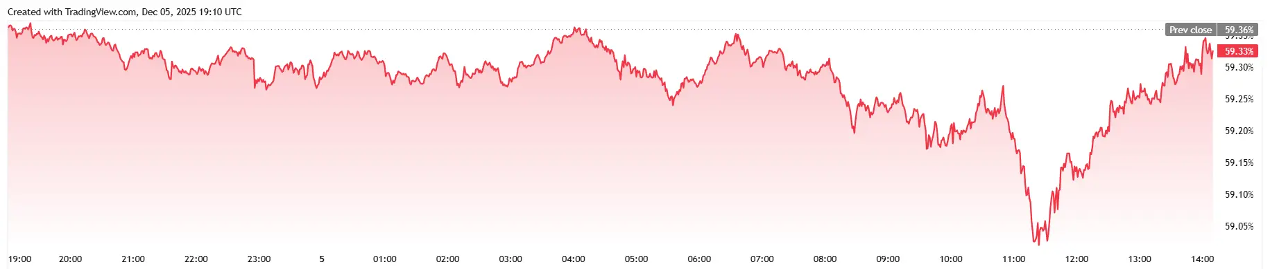 Volume perdagangan harian turun 2,04% di $64,18 miliar dan kapitalisasi pasar turun menjadi $1,77 triliun. Dominasi bitcoin sedikit turun, berkurang 0,07% menjadi 59,33%.