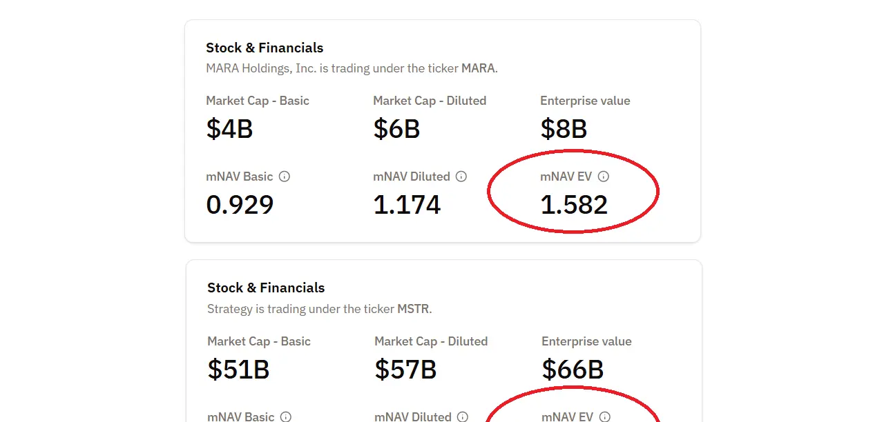 Perusahaan penambangan ini kini telah menerbitkan sekitar $3,3 miliar obligasi konversi, menurut laporan keuangannya yang terbaru. Hal ini tidak menimbulkan kekhawatiran saat bitcoin sedang reli, namun di $88K, kondisinya mulai goyah. Harga saham telah turun sekitar 50% seperti dicatat oleh Sigel. Namun itu tidak membuat Mara menjadi beli murah karena nilai perusahaan (enterprise value) melonjak, berkat miliaran utang yang harus dibayar. Obligasi yang beredar telah meningkatkan mNAV Mara, metrik yang melacak nilai perusahaan relatif terhadap nilai kepemilikan bitcoin perusahaan. Dengan kata lain, investor membayar jauh lebih mahal untuk saham Mara daripada yang bisa dibenarkan oleh cadangan BTC-nya.