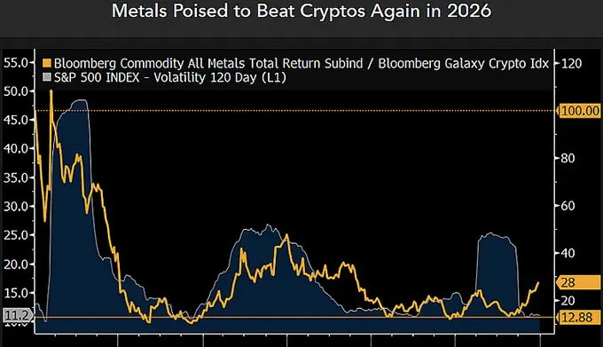 Sumber: CryptoNewsNet Judul Asli: Logam vs Kripto: Sinyal Volatilitas Menggeser Arah Menuju Logam di 2026 Tautan Asli: Data pasar yang dilacak oleh Bloomberg Intelligence menyoroti perbedaan yang semakin melebar antara logam dan aset kripto seiring dinamika volatilitas yang bergeser menjelang 2026, menurut analisis terbaru yang dibagikan oleh strategist Bloomberg Intelligence, Mike McGlone. Dua dataset terpisah fokus pada tren kinerja relatif, mengaitkan perilaku aset dengan volatilitas pasar saham daripada momentum spekulatif.
