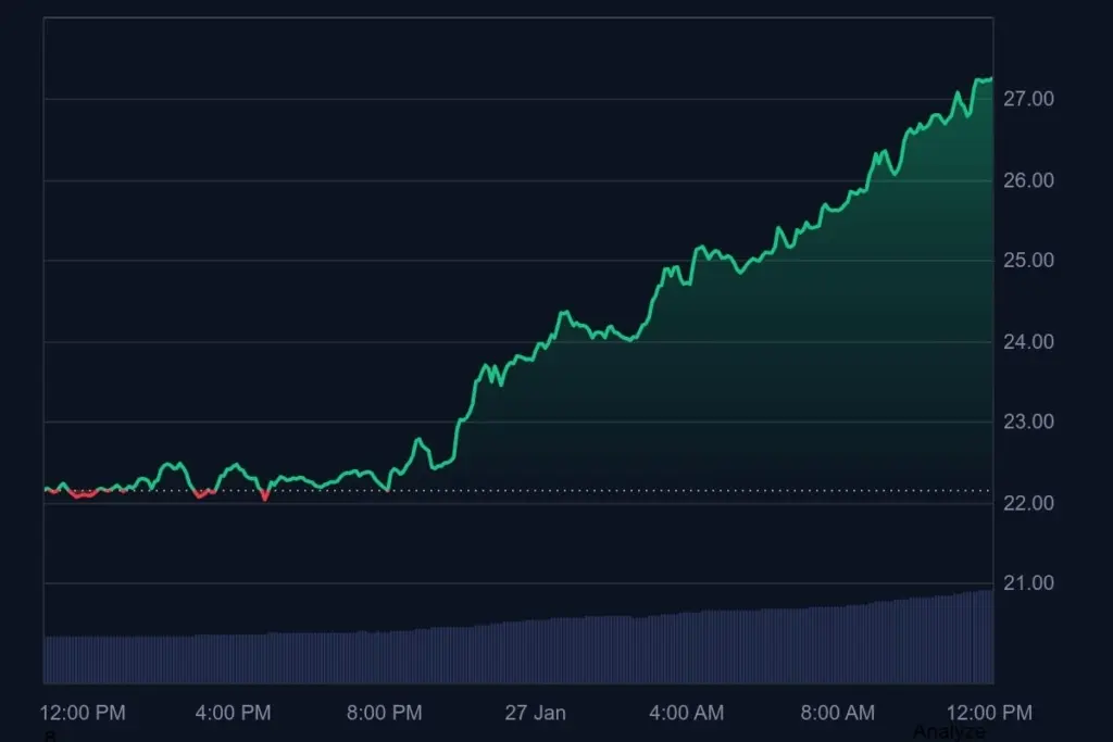 The opening price of the asset today was at a low of $22.03. With the sturdy bullish encounter in the HYPE market, the price climbed to a high range of $27.21, after testing and breaking pivotal resistance between $22.13 and $27.11 to confirm the uptrend. Upon the bulls staying for a longer period, the price could see more gains