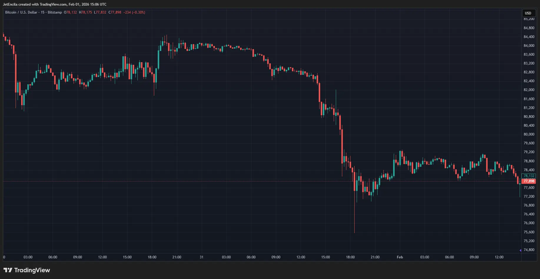 BTCUSD currently trading at $77,898. Chart: TradingViewYet, in past major rallies, gold’s gains were followed by a strong leg for Bitcoin. This time, the sequence stalled. Precious metals spiked and then pulled back sharply, but capital did not flow into crypto the way some expected. That raises questions about who is moving money and why.