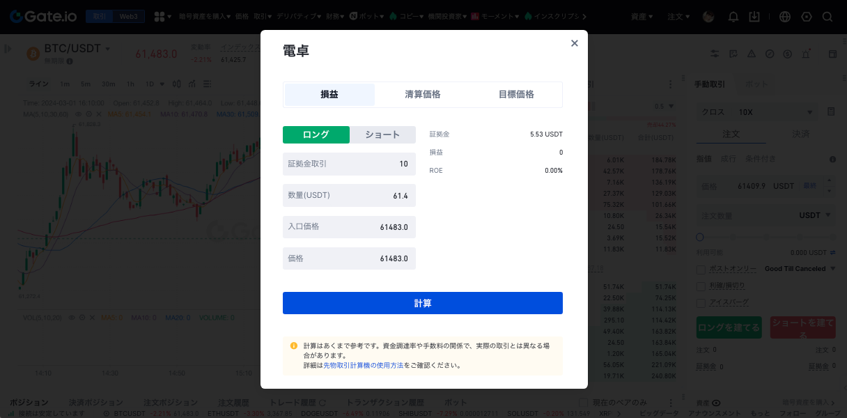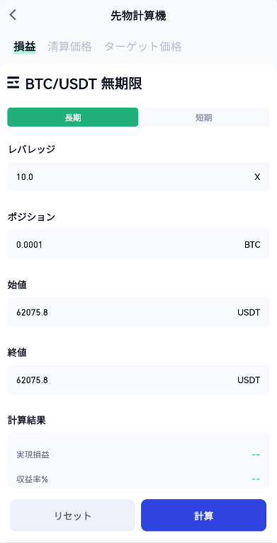 約定計算ページで「損益計算」をクリックし、「ロング/ショート」を選択し、対応するレバレッジ、ポジション、始値、終値を入力します。 、「計算」をクリックして、そのマージン、損益、および収益率を計算します。