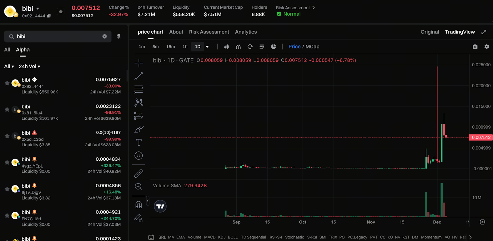 オンチェーンアドレスの一部は、時価総額が約100万ドルの段階でBIBIを大量に蓄積していました。こうした早期参入がセンチメントを押し上げ、投機サイクルをさらに後押ししました。