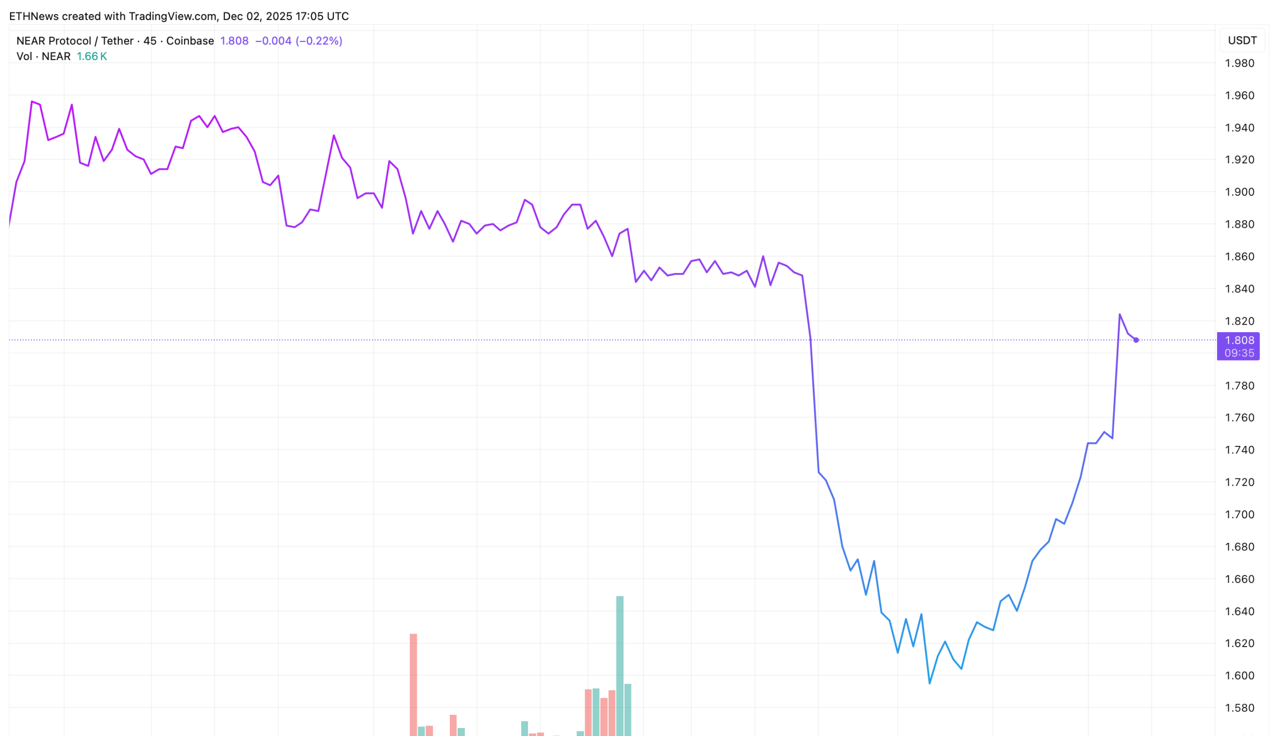 しかし、データは価格が$1.60に近づくにつれて買い手が積極的に参入したことを示しており、$1.78~$1.82の地域に向けて急速なV字回復を引き起こしました。日中の反転は、NEARが持続的な下落圧力の後に構造を再構築しようとする最初の重要な試みを示しています。