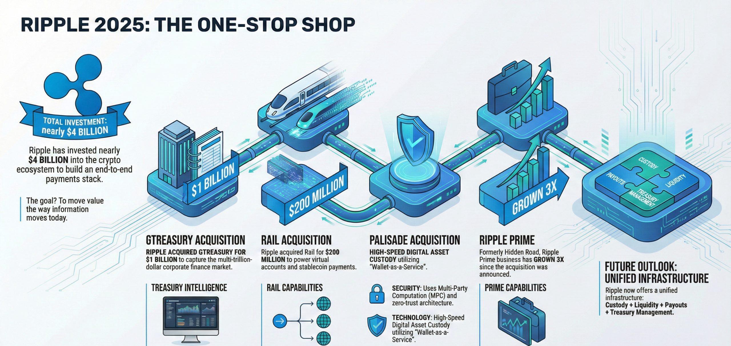 出典:CryptoNewsNet 元タイトル:Rippleが4つの主要買収を融合しワンストップ金融グリッドを構築 元リンク: Rippleによる統合型デジタル資産インフラへの拡大は、財務インテリジェンス、カストディ、流動性、決済を単一のエンタープライズプラットフォームに統合することで、リアルタイムのグローバル金融の中核を目指す動きであることを示しています。