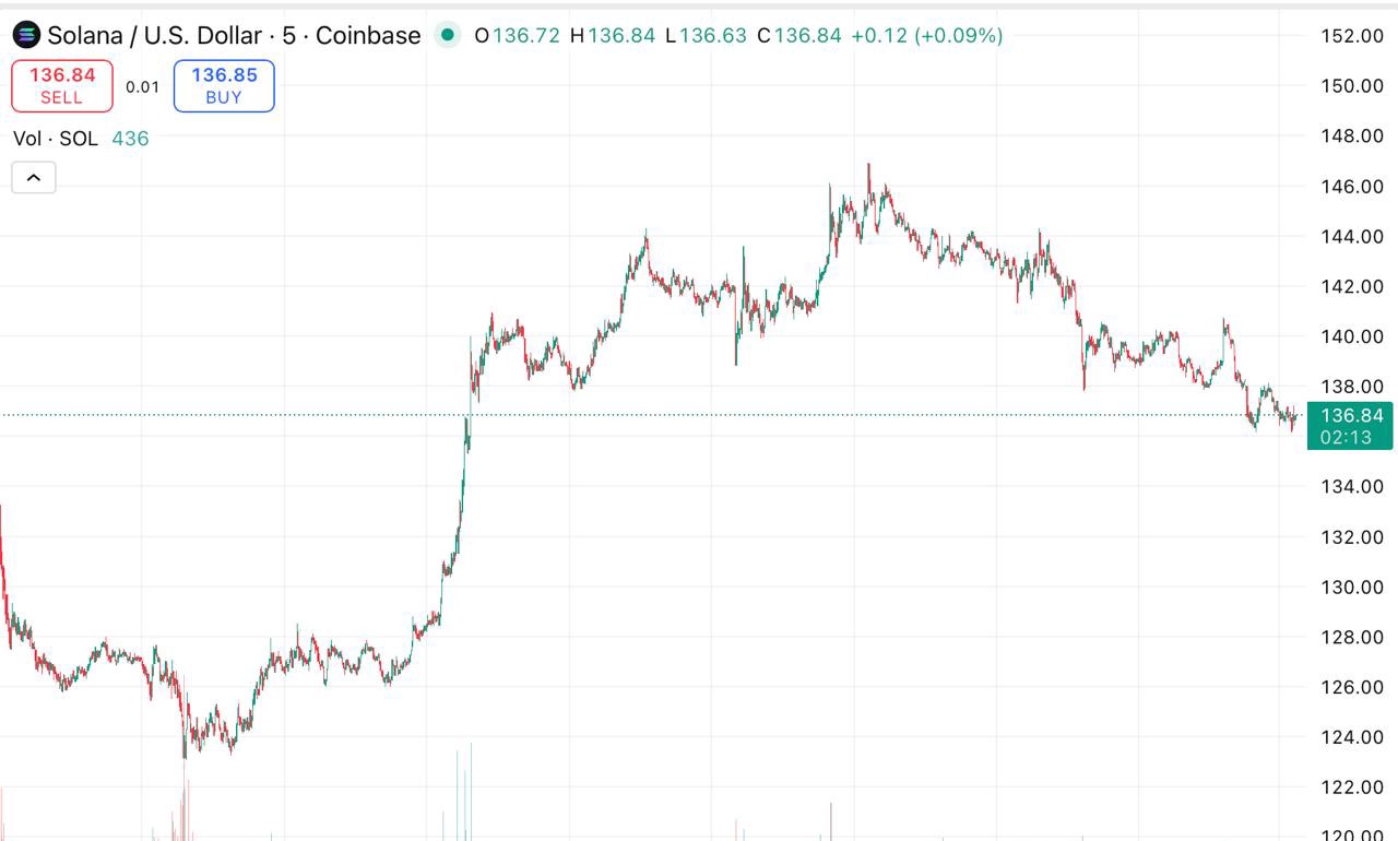 ソラナの5日間チャートでは、$122–$124 ゾーン付近で明確な蓄積ベースを形成し、その後高出来高のブレイクアウトで急騰する強い上昇インパルスが見られます。この垂直的な上昇によりSOLは瞬く間に中間$130 レンジに達し、短期的な高値・安値の切り上げによる新たな構造を築きました。