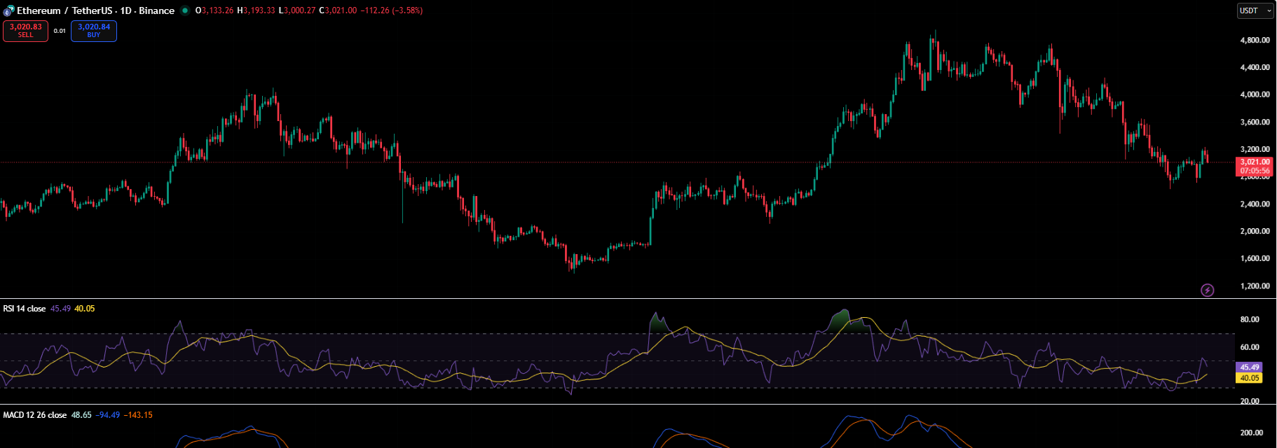 TradingViewの日足チャートでは、ETHは$3,020付近で取引され、1日で約3.5%下落しています。