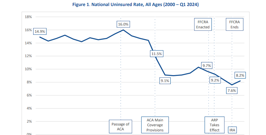 2024年時点でアメリカ人の8.2%が無保険で、2010年の16%から大きく減少している。