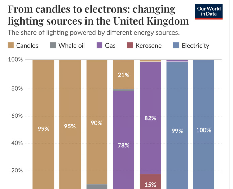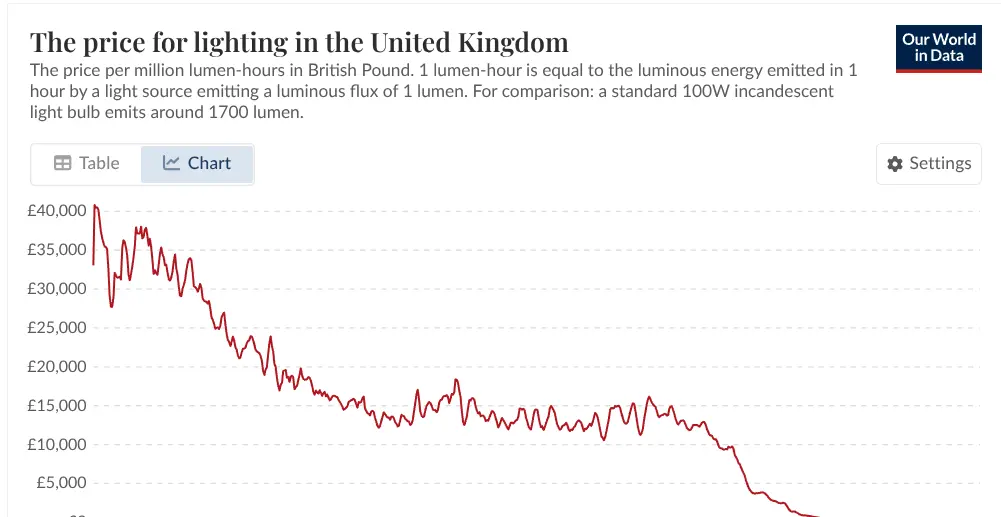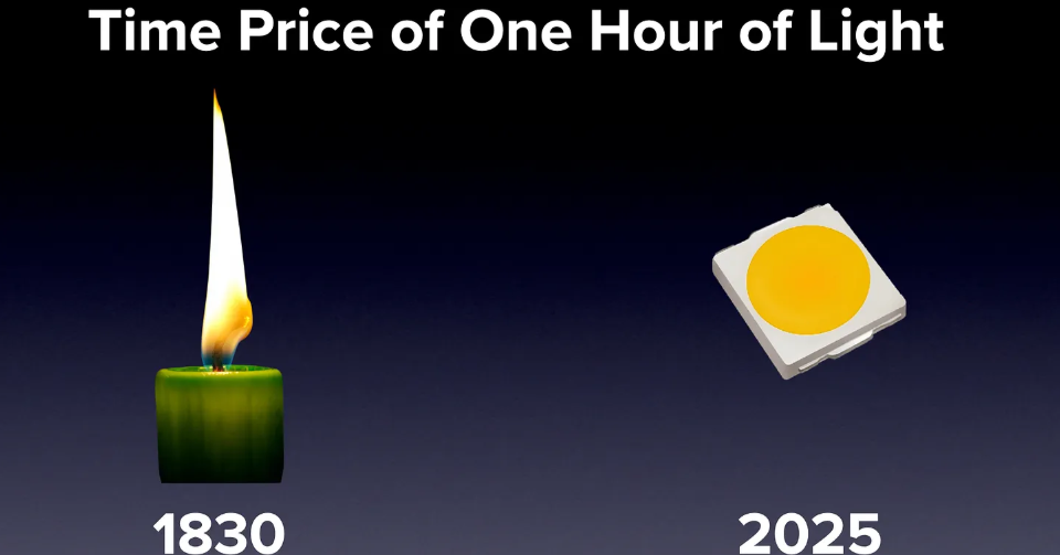 部屋を3時間照らすコスト――1800年には約3時間分の労働が必要だったものが、今では労働のごく一瞬で済む:公式統計がほぼ完全に見落とした約43,000倍もの改善だ。