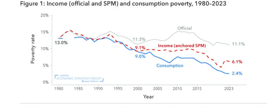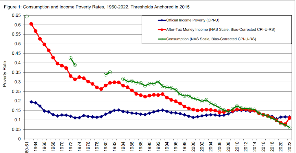「消費貧困」(緑色)と「税引後貧困」(赤色)を比較した学術研究では、公式のCPIベースの貧困指標は数十年にわたる改善を捉えきれていないことが示されている。