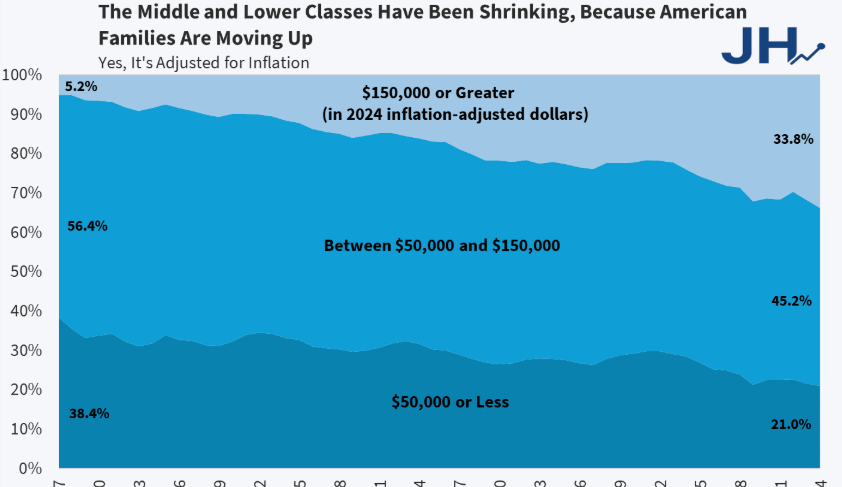 アメリカの中流階級は縮小しているが、それは上流階級が拡大しているからに過ぎない。1967年にはアメリカの家族の5.2%が$150,000(インフレ調整済み)以上を稼いでいたのに対し、今やほぼ34%に達している。