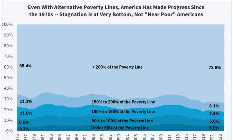連邦貧困ラインの2倍以上(4人家族で約$60,000)の収入を得るアメリカ人の割合は、1975年以来8.5ポイント上昇している。