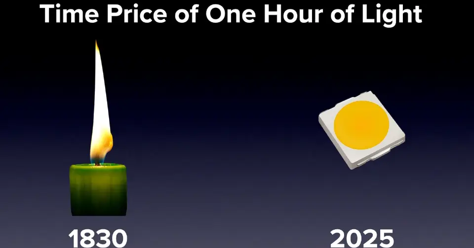 ウィリアム・ノードハウスは「時間価格」で光を計算することで、経済進歩をより実感できるものにした。1830年にはろうそく1時間分の光を得るのに3時間働く必要があったが、今ではその1時間分の光が1/13秒の労働で得られる。