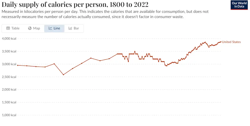 アメリカ人は1日あたり約3,800キロカロリーを消費している――これは1985年より15%多く、推奨量よりも約50%多い。