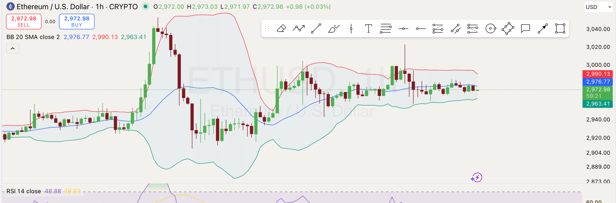 テクニカルチャートを見ると、Ethereumの価格はボリンジャーバンドの上下限の狭い範囲内で動いており、それぞれ$2,963と$2,990に位置しています。