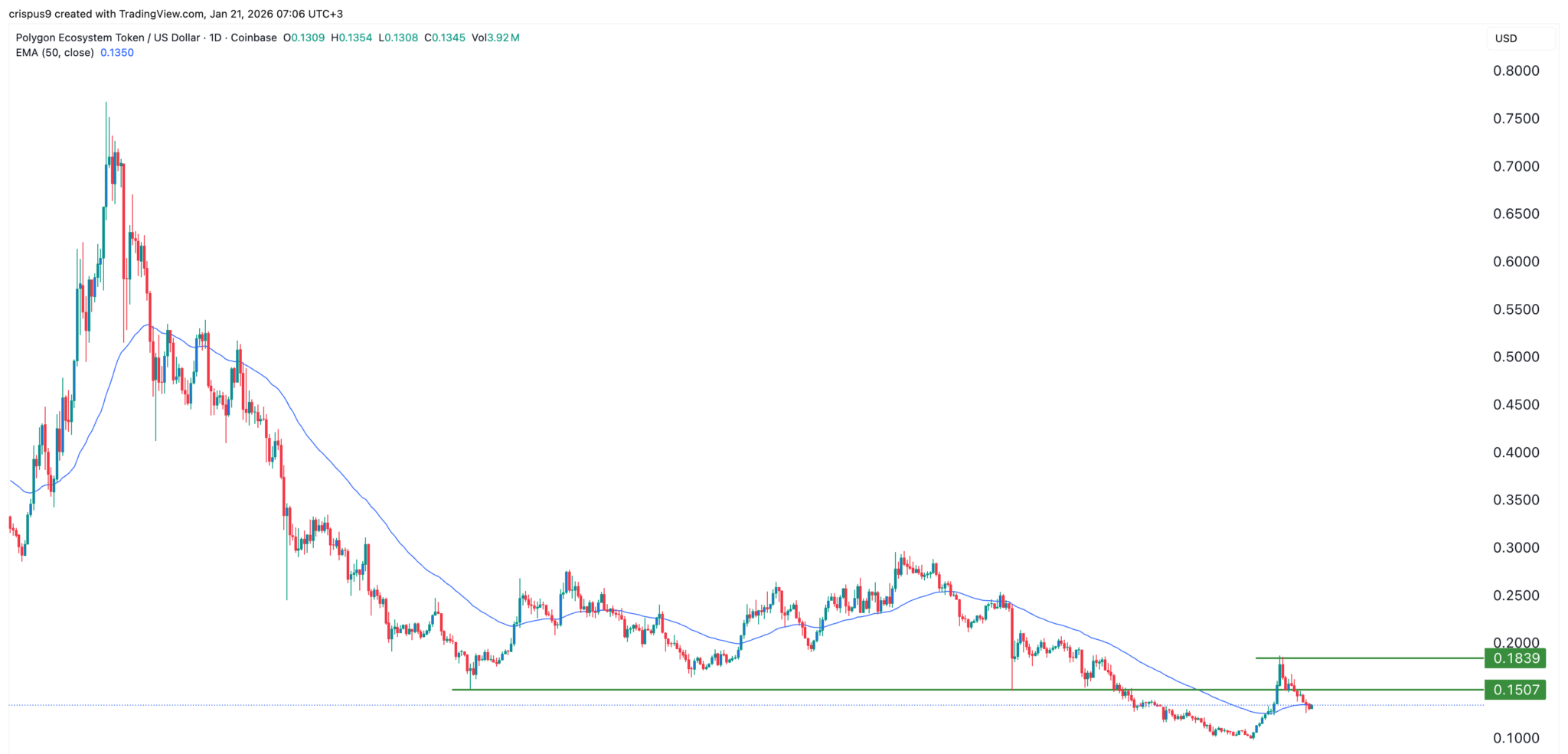 日足チャートを見ると、POL価格は$0.1840の年初来高値から$0.1343まで後退しています。重要なサポートレベルの$0.1500を下回り、昨年4月以来の最低水準となっています。