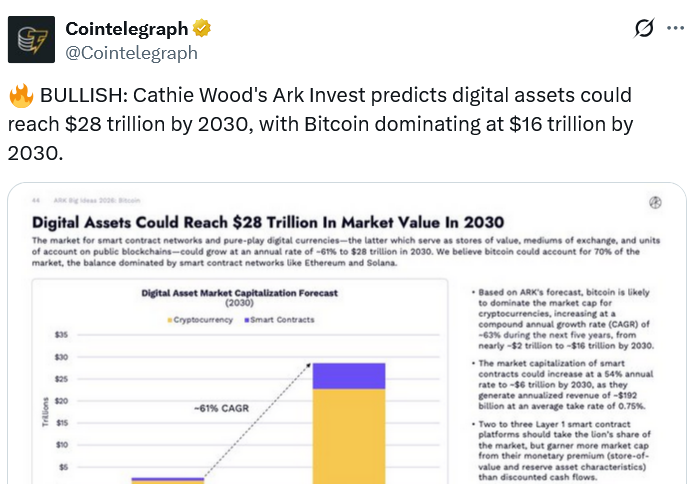 ARKは「Big Ideas 2026」レポートで、暗号市場は2030年までに(CAGR)で61%の複合年間成長率で拡大し、$28 兆ドルの目標を達成すると推定し、そのうちビットコインが70%を占める可能性があると述べた。