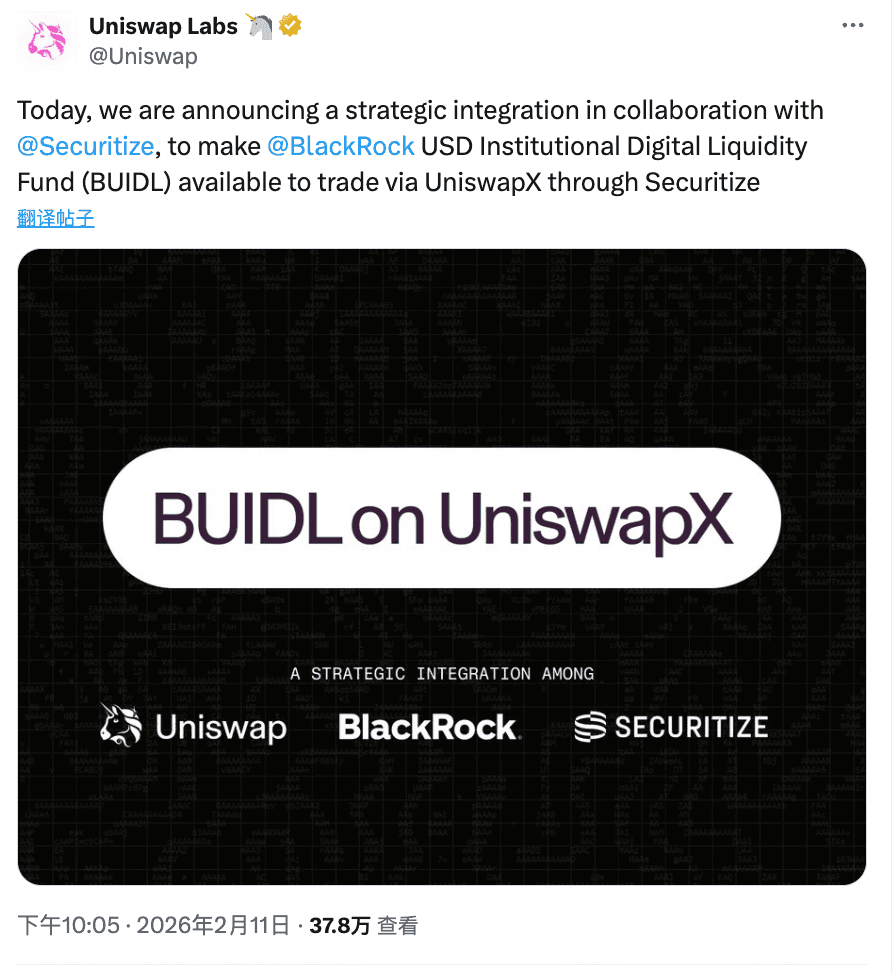 北京時間2月11日、世界最大の資産運用会社ブラックロック(BlackRock)は大きな衝撃をもたらした:規模18億ドルのトークン化国債ファンドBUIDLを正式にUniswapXに投入しただけでなく、初めて直接UniswapのネイティブトークンUNIを購入した。これが伝わると、Uniswapはブラックロックのニュースに牽引されて40%上昇し、その日の高値は4.57ドルに達した。
