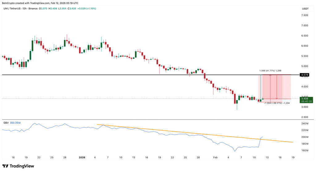 UNIは現在、3.52ドルから3.68ドルの流動性空白域に抑えられている。短期的なサポートは24時間最低値の3.22ドル付近にあり、これを割り込むと価格はさらに2.80ドル付近まで下落し、2月11日からの上昇ポイントの0.618フィボナッチリトレースメントに近づく。