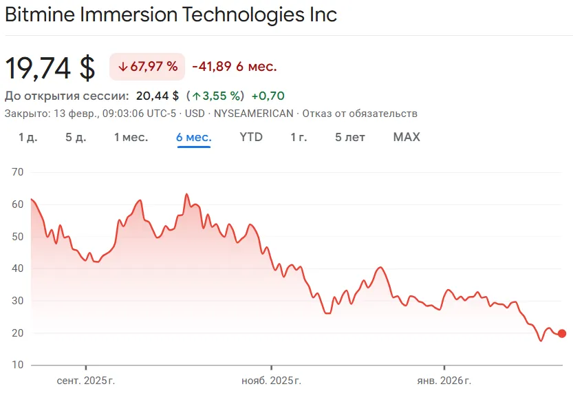 BitMineは、イーサリアムを保有する2番目に大きな企業です。暗号資産市場の暴落を背景に、同社の株価は過去半年で67.97%下落し、19.74ドルとなっています。未実現の損失は少なくとも66億ドルに上ります。