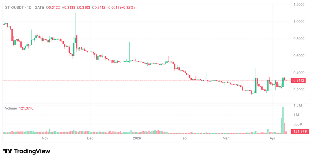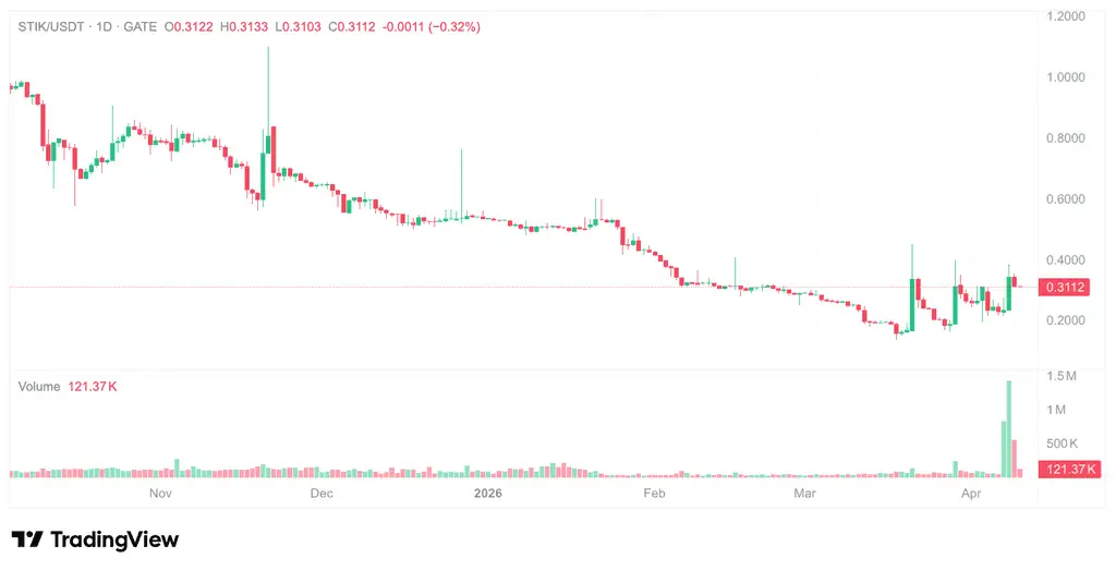 STIKは2026年3月下旬に、顕著な価格と取引量の異動を示した。これまでの統計によると、3月下旬の一週間で、STIKの価格は20%以上の上昇を記録し、取引高も同時に拡大、典型的な「急騰後の調整」パターンを示した。その後、価格はやや下落したが、全体として0.28ドルから0.34ドルの範囲内で震動している。4月10日時点で、STIKの価格は0.3114ドルである。
