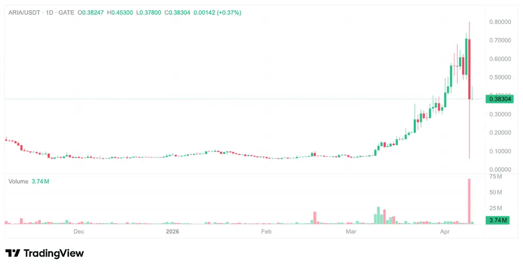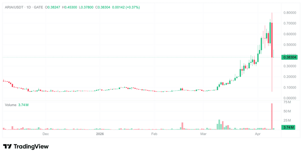 2026 年 4 月上旬、暗号市場の視線は AI セクターに集中していた。分散型計算能力のナarrativeが高まる中、ARIA トークンは激しい価格変動を経験した:わずか 24 時間で振幅が 1,260%を超え、約 0.06 ドルの安値から一時 0.83 ドルの歴史高値に達し、その後別の取引日で 43%以上の調整を見せた。この極端な価格行動は、市場にその背後にある構造的論理についての広範な議論を引き起こした。