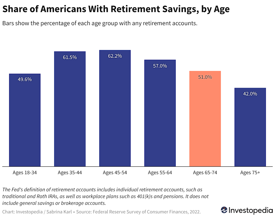 According to the Federal Reserve’s _Survey of Consumer Finances, _51% of households in their mid-60s to early 70s had money in retirement-specific accounts in 2022, the most recent year available. That’s the highest percentage for this age range since 2007, but lower than what most younger age groups reported, with the exception of those under 35.