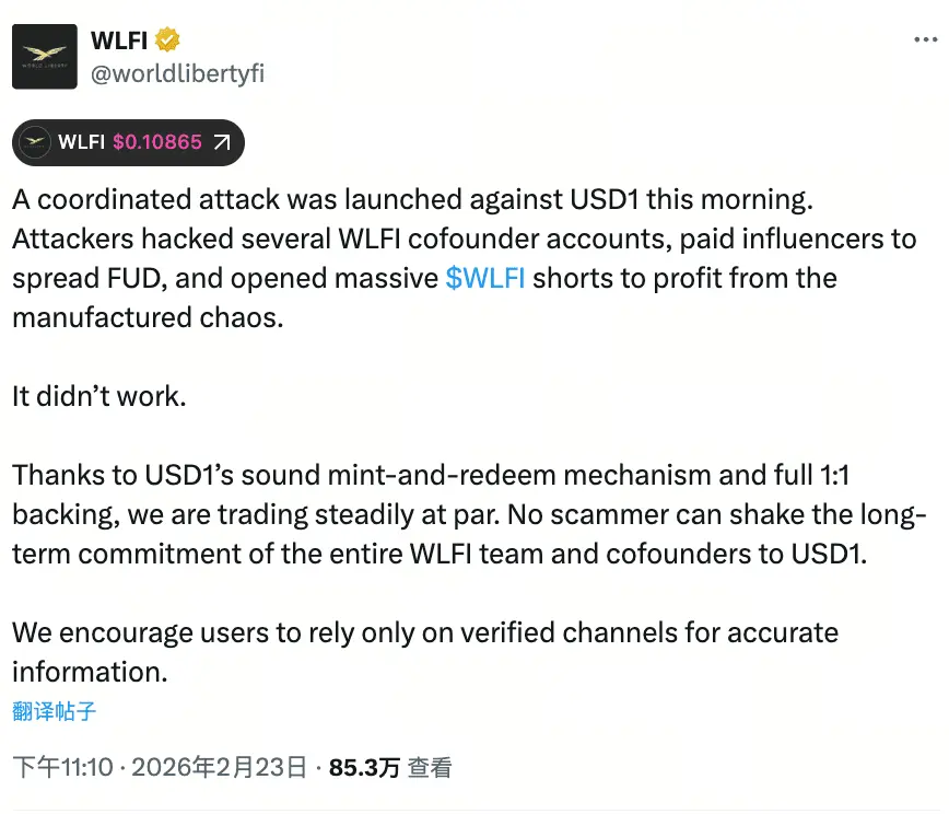 WLFI spokesperson David Wachsman emphasized in a statement to the media: “World Liberty’s top engineering and security teams successfully repelled a coordinated attack from multiple angles today. Our infrastructure and systems withstood the test, operating exactly as designed. The healthy minting and redemption mechanisms of USD1, fully backed 1:1 by assets, ensured the stablecoin quickly returned to its peg.”