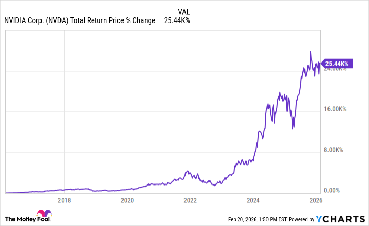 On Feb. 19, 2016, Nvidia was trading at a split-adjusted price of around $0.76. Ten years later, it’s trading at $187.95. That translates to a total return over that 10-year time frame (with minor dividends included) of around 25,440%!