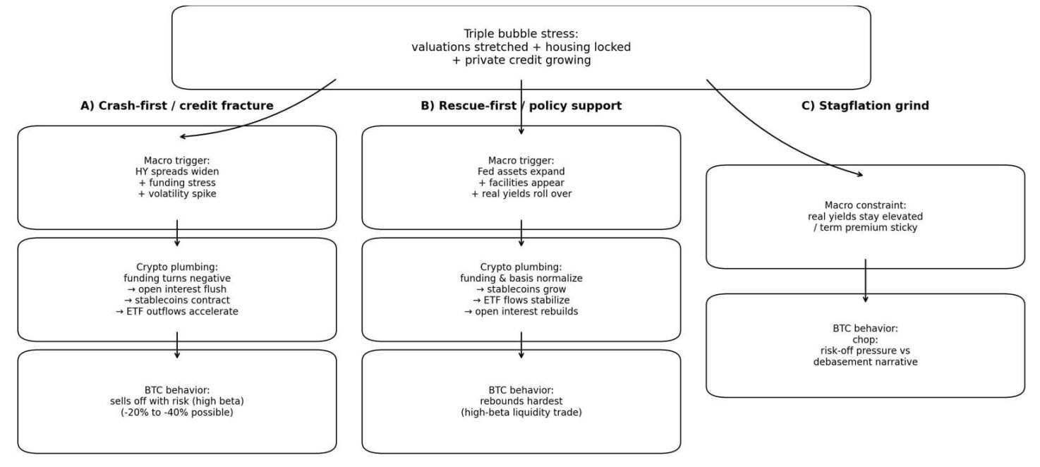 A flowchart illustrates three potential paths for Bitcoin under triple bubble pressure: credit collapse causing 20-40% sell-offs, policy bailouts triggering high-beta rebounds, or stagflation leading to price swings between safe-haven demand and currency devaluation narratives.