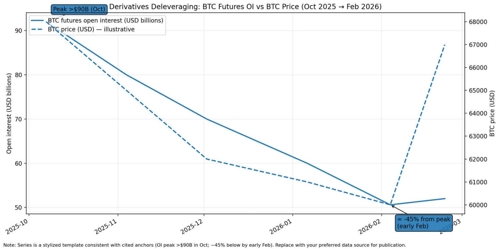 Bitcoin futures open interest peaked above $90 billion in October 2025, then declined by about 45% to early February 2026, while Bitcoin price fell from around $68,000 to near $60,000, then rebounded to about $67,000.