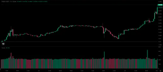 • Siren has posted the crypto market’s most significant intraday gain since midnight, surging 26.36%. 💡Bullish Momentum The powerful volume-backed breakout suggests strong conviction, though the absence of a public catalyst leaves the rally vulnerable to profit-taking. Key watch: Can buying volume be sustained above $30 million to propel a test of $0.50, or will it wane, allowing a retracement to $0.40?
